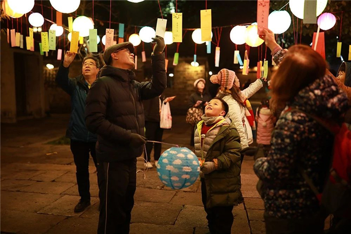 除了跨年晚宴,烏鎮(zhèn)跨年夜還恢復(fù)了“提燈走橋”、“放荷花燈”、“猜燈謎”等烏鎮(zhèn)傳統(tǒng)活動(dòng)。提著烏鎮(zhèn)特色燈籠行走在烏鎮(zhèn)的各座古橋中,有“提燈走十橋祛百病”的寓意,夜色迷蒙,各色人等手提燈籠,從烏鎮(zhèn)西柵平安橋、遷善橋一路走至西柵大街,燈火輝映,宛如行進(jìn)到另一個(gè)時(shí)空。