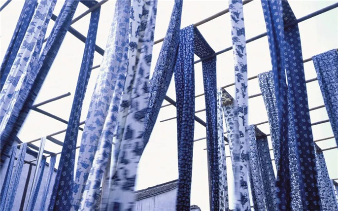 酒坊隔壁的宏源泰染坊也是劇中很重要的一個(gè)場(chǎng)景,無(wú)論染坊旁邊的巷子,還是曬布場(chǎng)了高高掛起,紛紛錯(cuò)錯(cuò)的藍(lán)印花布,成匹的在風(fēng)中飄動(dòng)著。走進(jìn)這里,仿佛走進(jìn)英匆匆逃離烏鎮(zhèn)時(shí),飄忽間像要迷失在由花布組成的迷宮中。